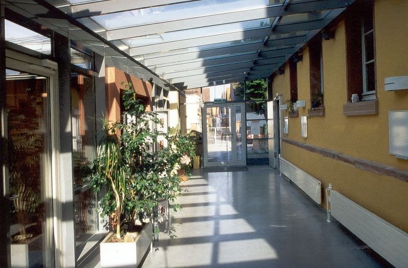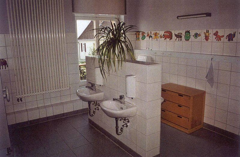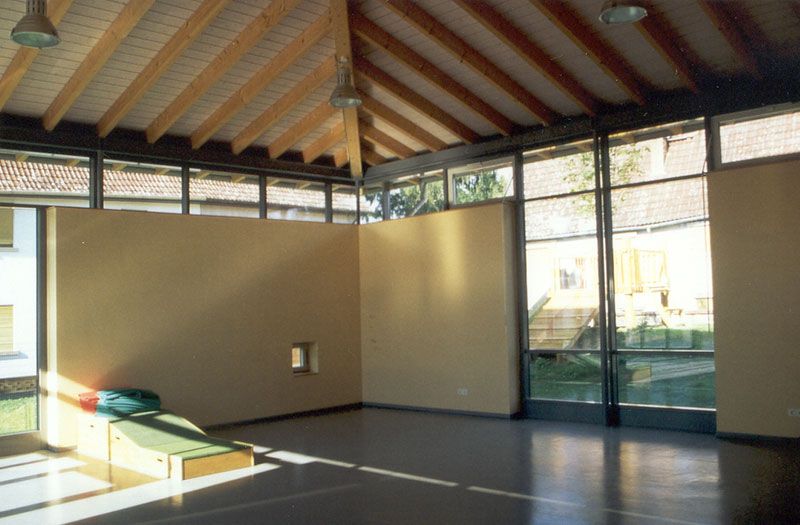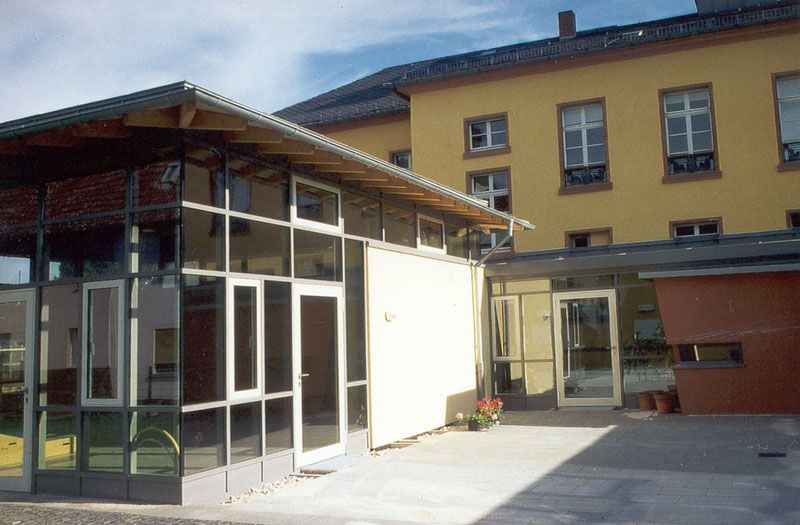 Bei dem denkmalgeschützten Gebäude „Alte Schule“ handelt es sich um einen 2-geschossigen Baukörper mit Walmdach. Es wurden Instandsetzungsmaßnahmen durchgeführt und das als Schule genutzte Gebäude zu einer Kindertagesstätte umgenutzt. Um das Raumprogramm für eine 4-gruppige Kindertagesstätte zu erfüllen, wurde ein Anbau angegliedert. Bei dem Anbau handelt es sich um zwei im Grundriss quadratische Erweiterungsbauten mit Zeltdächern, die durch einen Verbindungsbau mit dem Bestand verbunden wurden.