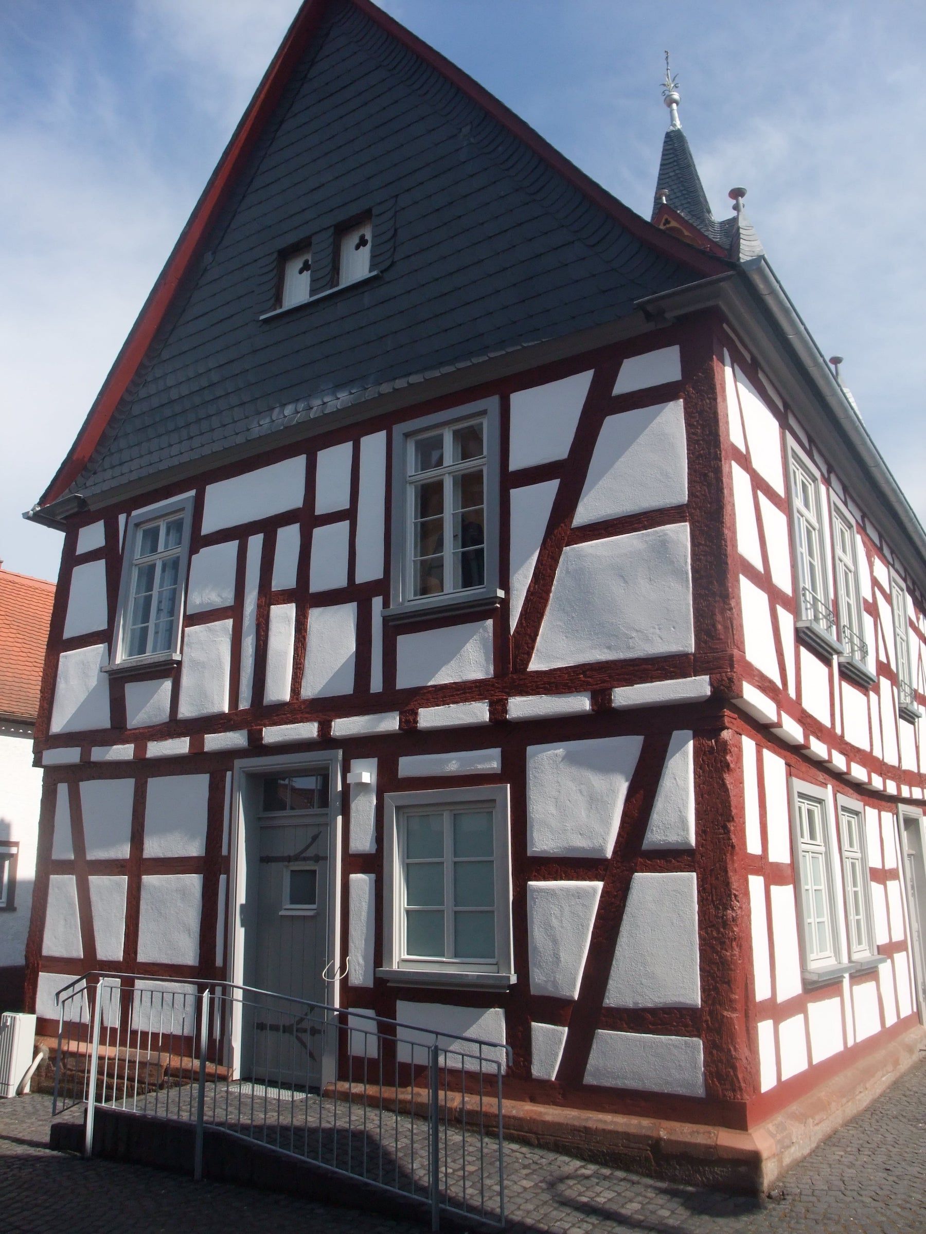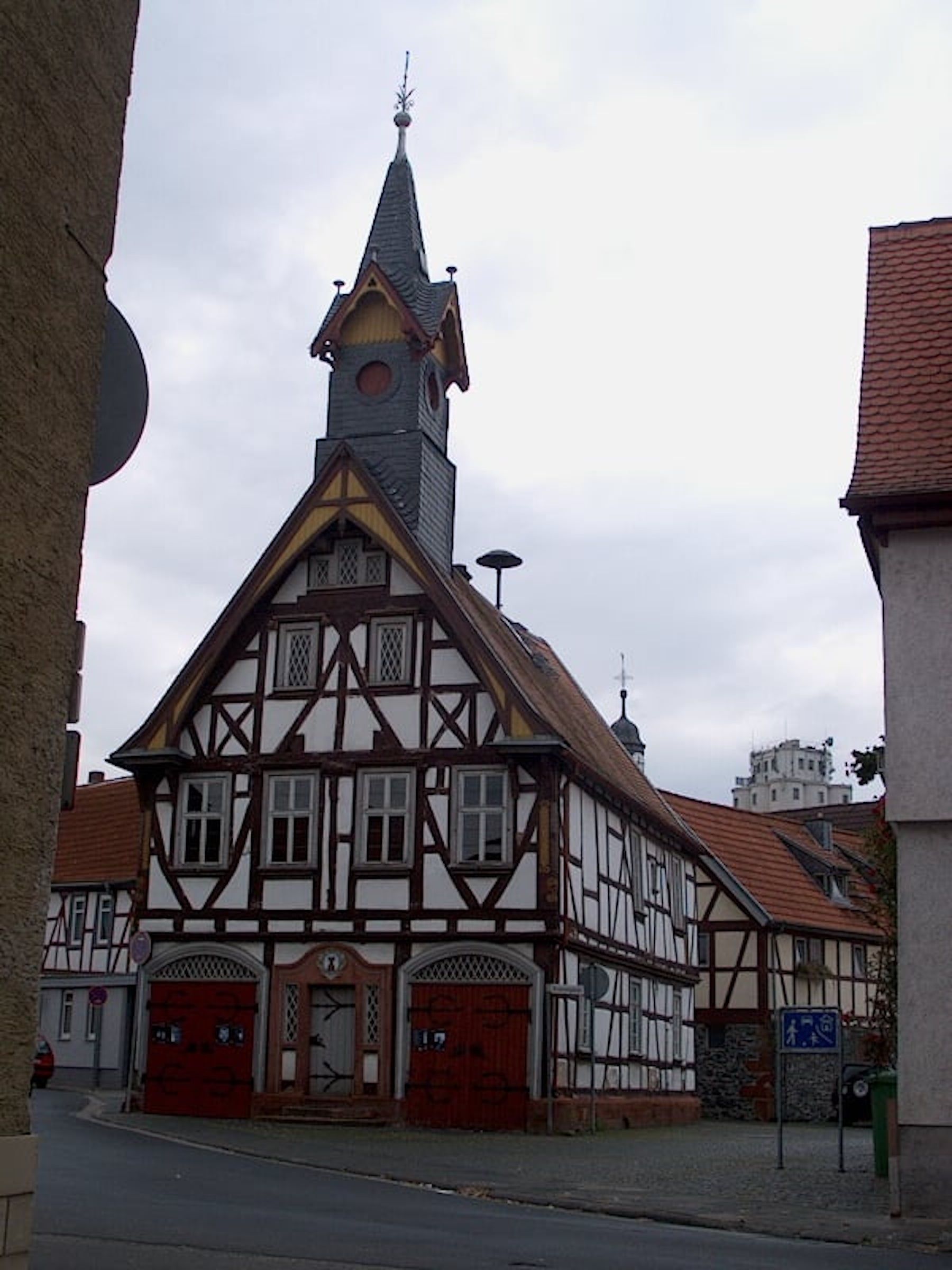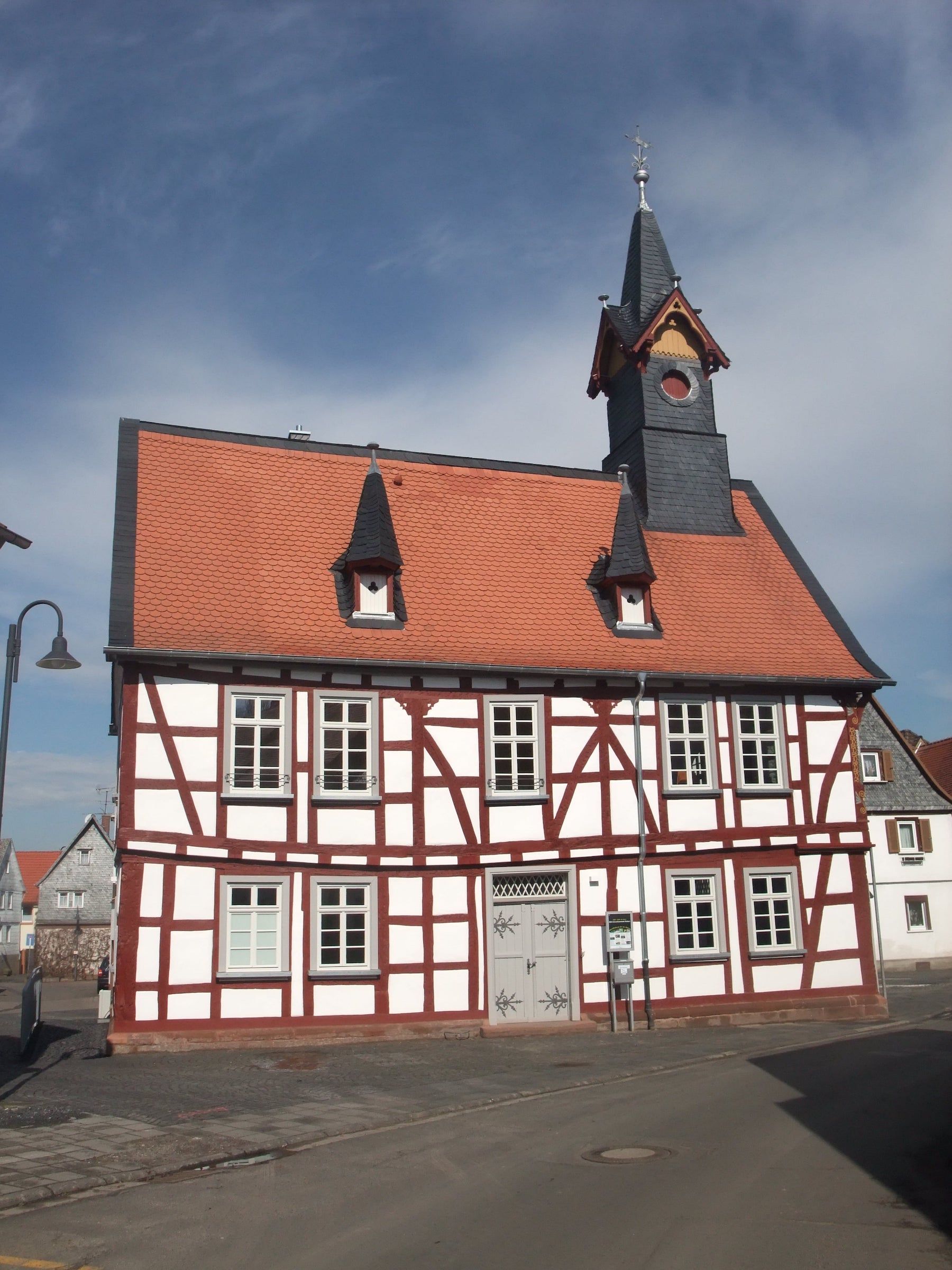 „Zweigeschossiger Fachwerkbau am platz-artigen Aufeinandertreffen von Wirtsgasse und Hauptstrasse; ein Stadtwappen am Portal auf der östlichen Giebelseite trägt die Datierung 1744, dabei handelt es sich aber um einen Teil der wiederverwendeten ehemaligen Fassung des Marktbrunnens. Ältere Gemeindeabrechnungen sollen eine Bauzeit um 1610 belegen. Das heutige Erscheinungsbild des alten Rathauses wird nicht unwesentlich von einer Umgestaltung 1822 geprägt.“
