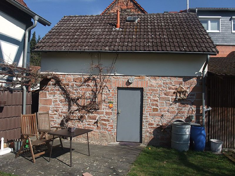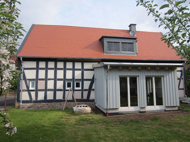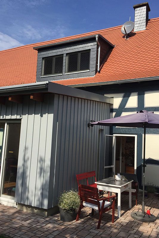Bei dem Wohnhaus in Gelnhausen wurde ein Anbau im Erdgeschoss nach Süden zur Erweiterung des Wohnraumes errichtet. Dadurch entstehen rund 20 qm zusätzlicher Wohnraum. Vormals als Abstellräume genutzte Bereichen im Erdgeschoss und Dachgeschoss wurden ebenso zu Wohnzwecken umgenutzt.