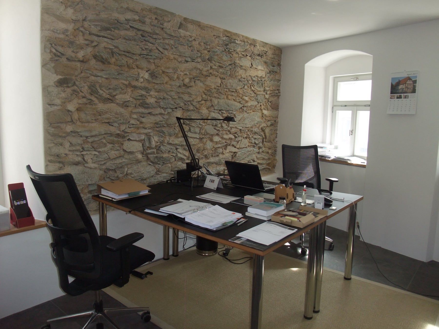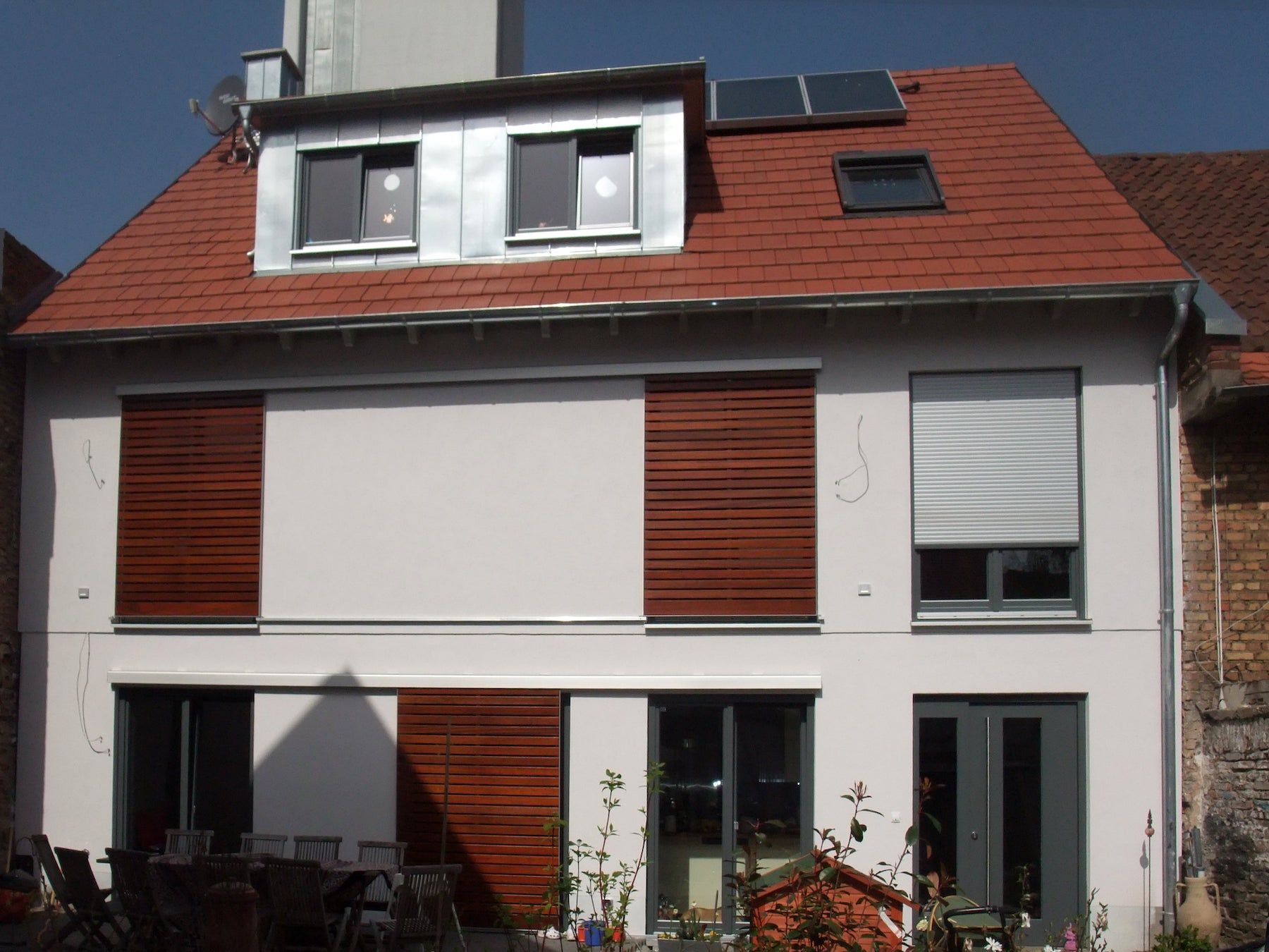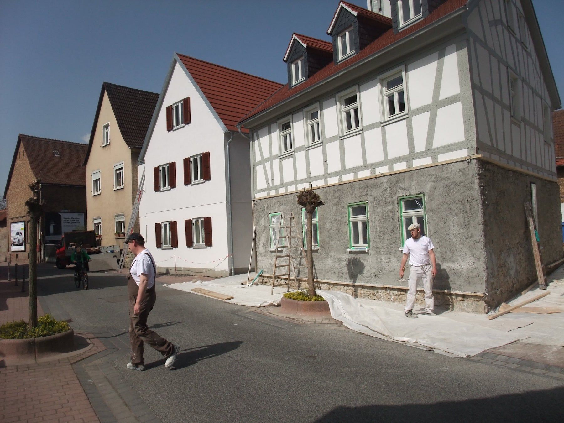 Auf dem attraktiven Grundstück befanden sich mehrere alte Scheunen und Lagerhallen - und eine unter Denkmalschutz stehende „Alte Schule“. Die „Alte Schule“ wird nun im Erdgeschoss als Büro, darüber zweigeschossig als Wohnung genutzt. Der straßenseitige Neubau in Massiv- und Holzbauweise beherbergt eine Arztpraxis und eine Maisonette-Wohnung. Die rückwärtige Scheune wurde abgerissen. In Holzbauweise wurde ein großes Wohnhaus neu errichtet.