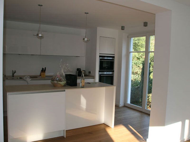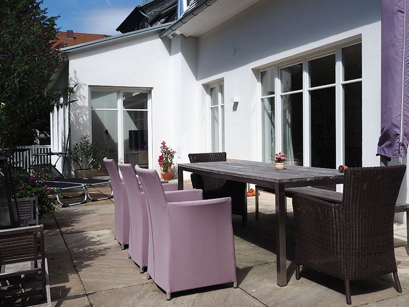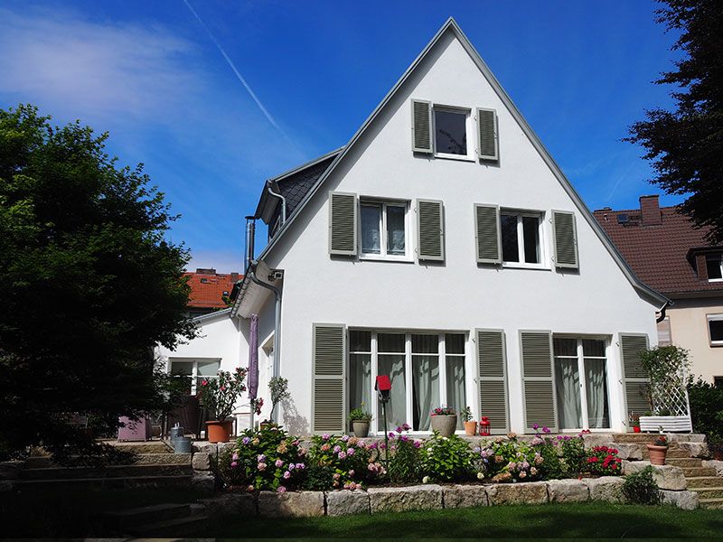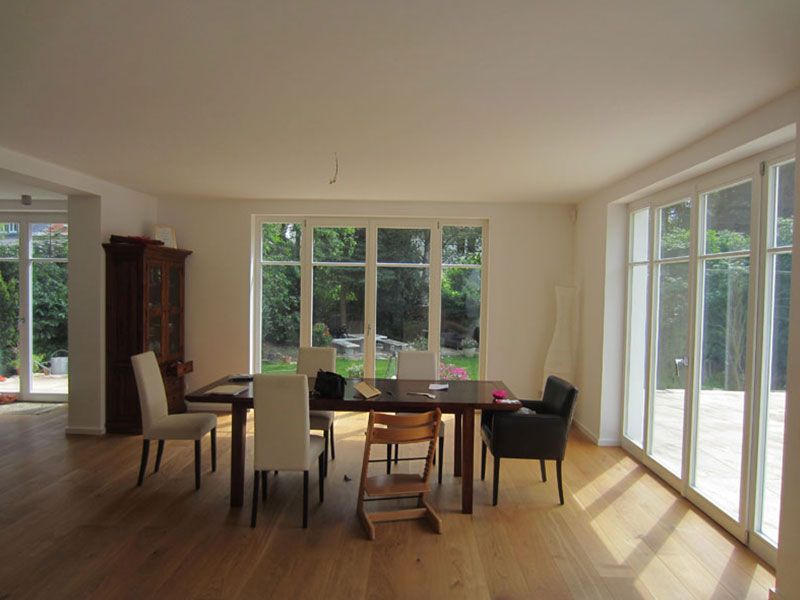 Bei dem Wohnhaus in Frankfurt wurde ein Anbau im Erdgeschoss im Bereich der Küche sowie des Wohnzimmer errichtet. Zusätzlich wurde im Dachgeschoss der rückwärtige Terrassenbereich mit einem Satteldach überbaut, um weiteren Wohnraum zu schaffen.