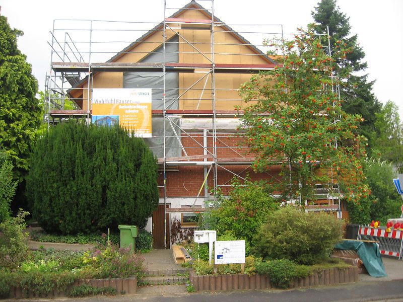 Das Heinlein-Fertighaus aus den 60er Jahren wurde aufgestockt. Die Statik des bestehenden Hauses erforderte eine umlaufende Stahlkonstruktion, auf der das neue Dachgeschoss aufgelagert wurde.